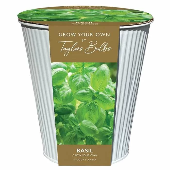 An edible basil herb seed planter gift set. A gift set of basil herb seeds, compost pellets, and instructions presented within a beautifully painted metal planter. An ideal gift that contains everything needed for a budding gardener (or chef!) who is looking to grow basil from seed, the leaves of which are used to flavour Mediterranean dishes, pesto and other culinary accompaniments. Grows to 30cm. Growing instructions: Make the compost by placing the peat-free compost pellet in a suitable mixing container and add 350ml of lukewarm water. Allow to stand and expand for 30-60 minutes, drain off any excess water and mix compost well. You may have compost than you require and more water could be required if the compost mix is looking dry. When ready to plant, fill 80% of the planter with compost, scatter seeds evenly on the surface, cover with a very thin layer of compost and gently moisten. Move to a warm, well-lit area; a windowsill is ideal but full sunshine will dry out the compost rapidly. The compost must be kept moist at all times, never being allowed to dry out. Seeds will germinate after approximately 3-4 weeks. Contents: Basil seeds & peat-free compost pellet.